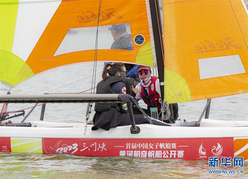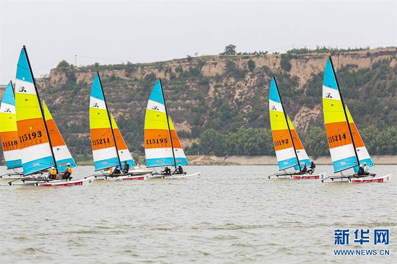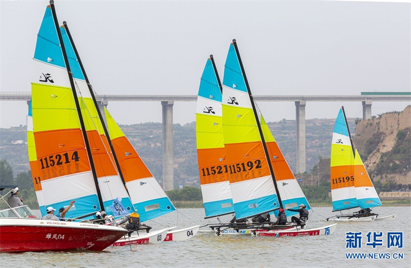 5月23日,河南三门峡,帆船赛比赛现场。5月23日,2023中国三门峡女子帆船赛暨第二届三门峡帆船公开赛在三门峡天鹅湖国家城市湿地公园黄河水域举行。据介绍,本次比赛是第二十八届三门峡黄河文化旅游节的活动之一,旨在推动三门峡文旅产业和体育项目的进一步融合发展。