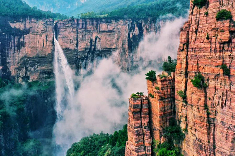 独属于太行山脉的红色石头,造就了新乡南太行独有的红岩绝壁,雄浑苍劲的太行绝壁伟岸耸立,峡谷延绵无际,雄奇壮观。