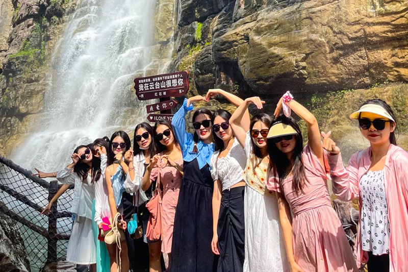峡谷中有一整面岩壁的瀑布群,瀑布跌宕,水花飞溅,碧潭如玉,清爽宜人。美景不挑服装,无论是什么妆造,随意去拍都是靓丽风景。