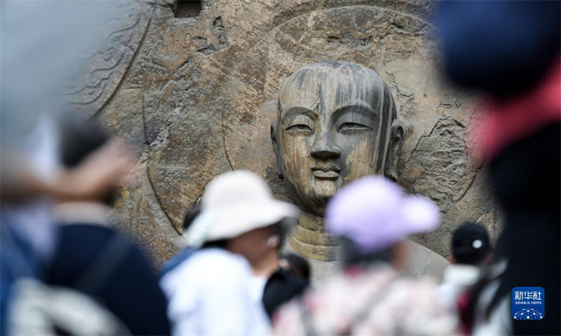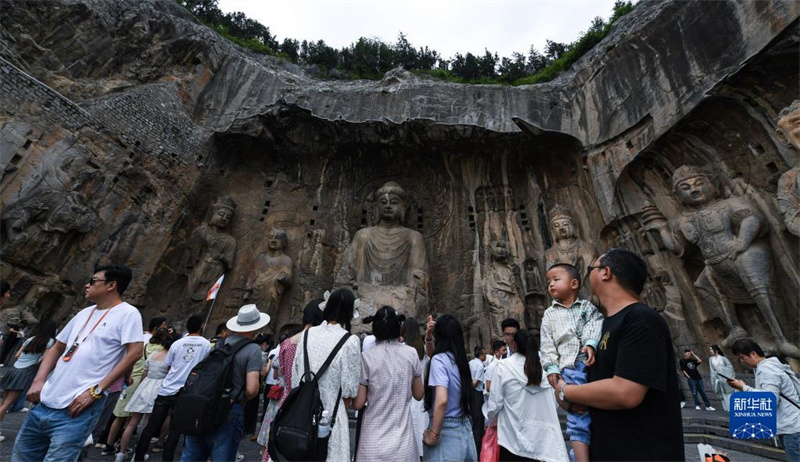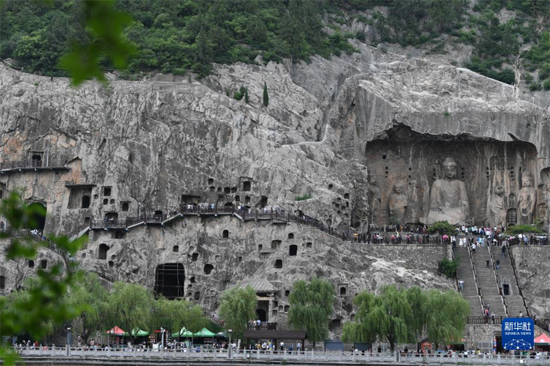 6月5日,游客在洛阳龙门石窟景区游览。眼下,河南洛阳龙门石窟景区正值旅游旺季,精美的石刻佛像吸引众多游客参观。龙门石窟位于洛阳市南郊,开凿于北魏孝文帝迁都洛阳时期,迄今有1500多年历史,2000年龙门石窟被列入《世界遗产名录》。