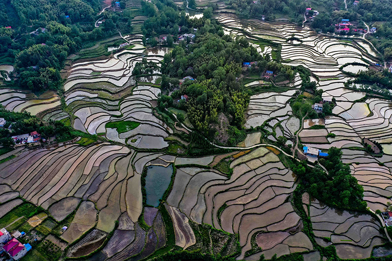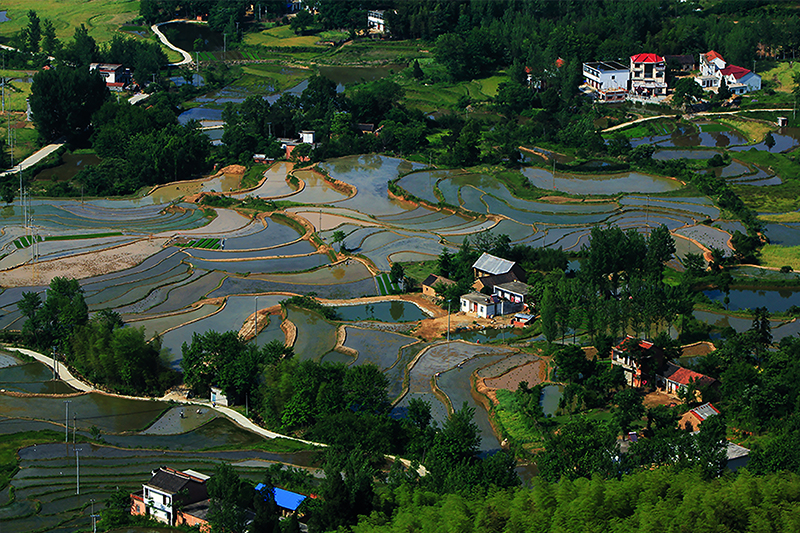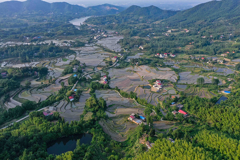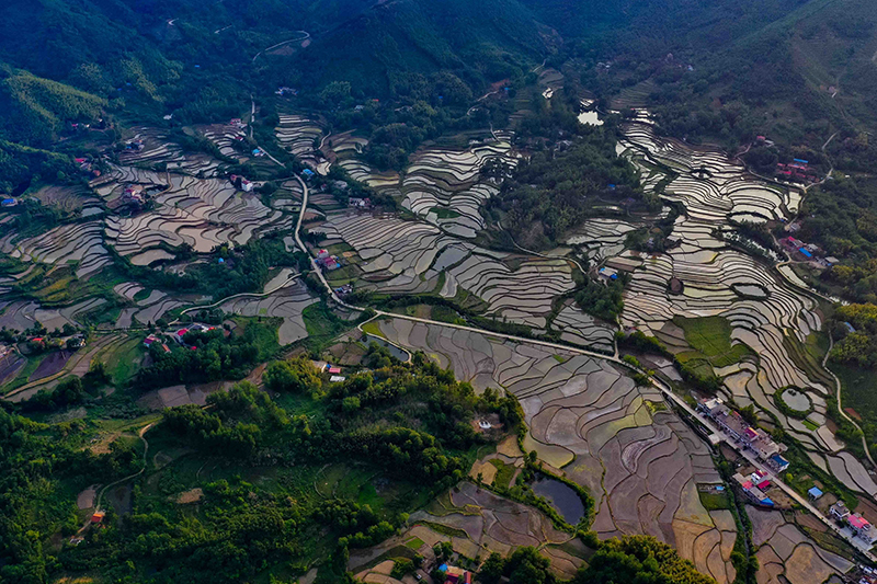 如今夏季到来,依山而下的梯田与错落有致的民居相互衬托,山峦林木苍翠,自上而下看,格外秀美,显然一幅夏日田园风光画卷。