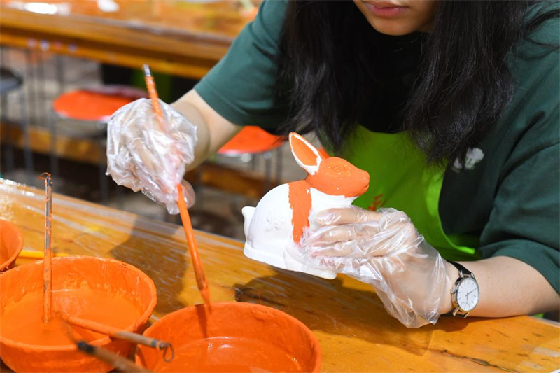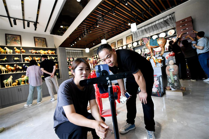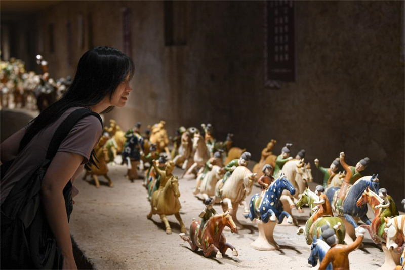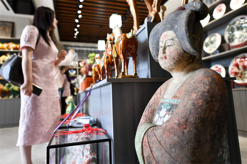 6月6日,游客在南石山村的唐三彩作品陈列展示馆内参观。河南省洛阳市朝阳镇南石山村以生产唐三彩而闻名。近年来,当地政府积极引导三彩产业数字化建设工作,推动唐三彩烧制技艺传习馆、唐三彩陶艺博物馆、唐三彩文化研学所等优化升级。目前,南石山村唐三彩产业的专业烧制艺人有2000余人、文化企业68家,年产值达3.5亿元。