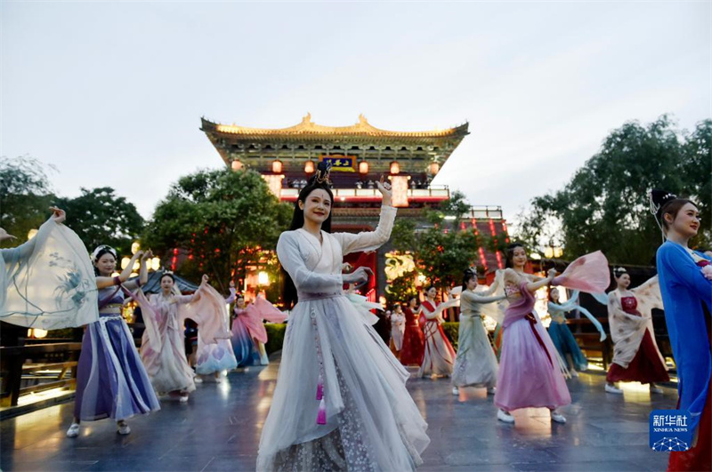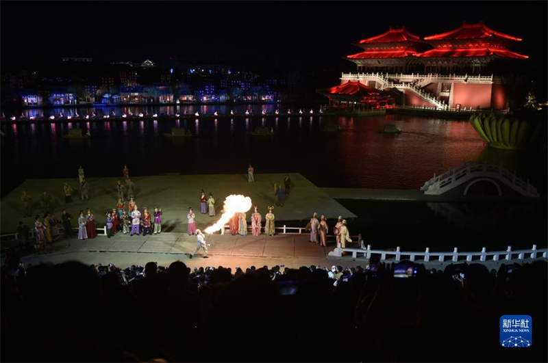 6月7日晚,游人在开封清明上河园内观赏大型水上实景演出《大宋·东京梦华》。夏日夜晚,河南省开封市清明上河园内灯火辉映,游人往来,展现“大宋不夜城”的热闹景象。