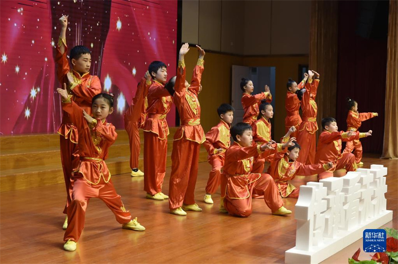 6月8日,学生们在活动现场表演武术。当日,一场主题为“创意非遗嘉年华”的非遗项目展示体验活动在河南省郑州经济技术开发区列子小学举行。作为河南省非物质文化遗产社会传承基地,列子小学在活动现场设置非遗工坊体验、非遗节目展演等内容,让参与活动的嘉宾和学生沉浸式感受传统文化魅力,推动非物质文化遗产的传承与发展。