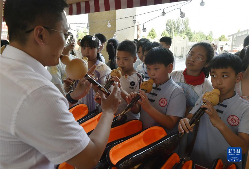 6月8日,学生们在活动现场体验吹奏葫芦丝。当日,一场主题为“创意非遗嘉年华”的非遗项目展示体验活动在河南省郑州经济技术开发区列子小学举行。作为河南省非物质文化遗产社会传承基地,列子小学在活动现场设置非遗工坊体验、非遗节目展演等内容,让参与活动的嘉宾和学生沉浸式感受传统文化魅力,推动非物质文化遗产的传承与发展。