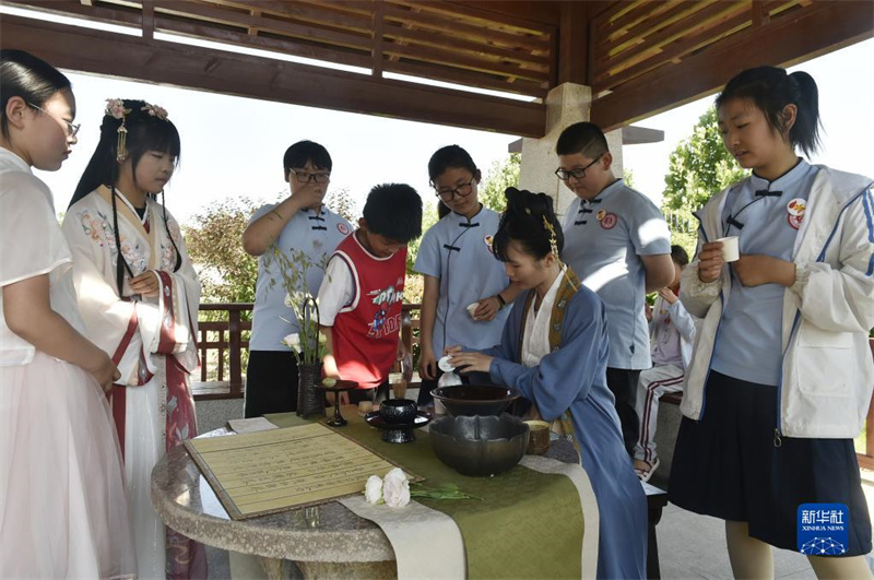 6月8日,学生们在活动现场观赏传统茶艺展演。当日,一场主题为“创意非遗嘉年华”的非遗项目展示体验活动在河南省郑州经济技术开发区列子小学举行。作为河南省非物质文化遗产社会传承基地,列子小学在活动现场设置非遗工坊体验、非遗节目展演等内容,让参与活动的嘉宾和学生沉浸式感受传统文化魅力,推动非物质文化遗产的传承与发展。