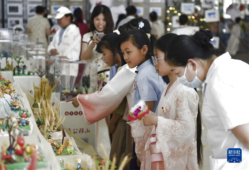 6月8日,学生们在活动现场参观展出的非遗作品。当日,一场主题为“创意非遗嘉年华”的非遗项目展示体验活动在河南省郑州经济技术开发区列子小学举行。作为河南省非物质文化遗产社会传承基地,列子小学在活动现场设置非遗工坊体验、非遗节目展演等内容,让参与活动的嘉宾和学生沉浸式感受传统文化魅力,推动非物质文化遗产的传承与发展。