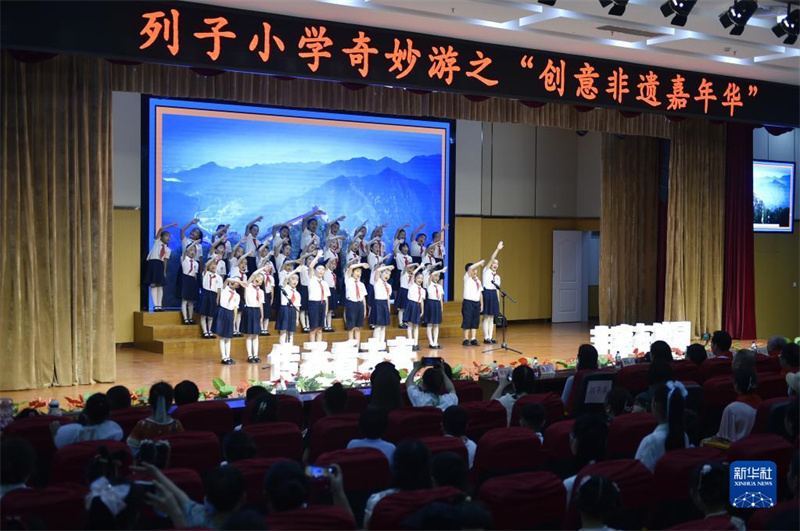 6月8日,学生们在活动现场合唱表演。当日,一场主题为“创意非遗嘉年华”的非遗项目展示体验活动在河南省郑州经济技术开发区列子小学举行。作为河南省非物质文化遗产社会传承基地,列子小学在活动现场设置非遗工坊体验、非遗节目展演等内容,让参与活动的嘉宾和学生沉浸式感受传统文化魅力,推动非物质文化遗产的传承与发展。