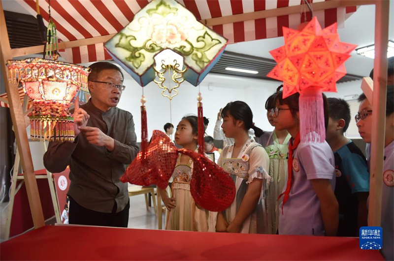 6月8日,学生们在活动现场观赏非遗项目“汴京灯笼张”的彩灯作品。当日,一场主题为“创意非遗嘉年华”的非遗项目展示体验活动在河南省郑州经济技术开发区列子小学举行。作为河南省非物质文化遗产社会传承基地,列子小学在活动现场设置非遗工坊体验、非遗节目展演等内容,让参与活动的嘉宾和学生沉浸式感受传统文化魅力,推动非物质文化遗产的传承与发展。