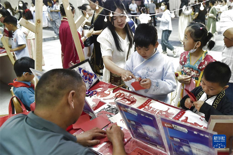 6月8日,学生们在活动现场体验剪纸技艺。当日,一场主题为“创意非遗嘉年华”的非遗项目展示体验活动在河南省郑州经济技术开发区列子小学举行。作为河南省非物质文化遗产社会传承基地,列子小学在活动现场设置非遗工坊体验、非遗节目展演等内容,让参与活动的嘉宾和学生沉浸式感受传统文化魅力,推动非物质文化遗产的传承与发展。