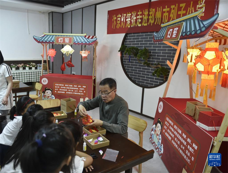 6月8日,学生们在活动现场观看非遗项目“汴京灯笼张”的彩灯制作技艺。当日,一场主题为“创意非遗嘉年华”的非遗项目展示体验活动在河南省郑州经济技术开发区列子小学举行。作为河南省非物质文化遗产社会传承基地,列子小学在活动现场设置非遗工坊体验、非遗节目展演等内容,让参与活动的嘉宾和学生沉浸式感受传统文化魅力,推动非物质文化遗产的传承与发展。