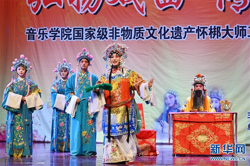 6月8日,焦作师范高等专科学校学生活动中心礼堂,沁阳市怀梆艺术保护传承中心演员在演出传统怀梆折子戏《锦袍记》。