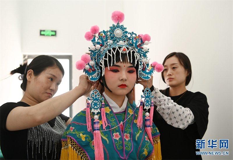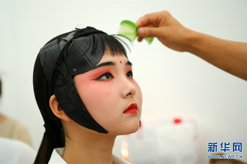 6月8日,焦作师范高等专科学校学生活动中心礼堂,该校音乐学院2022级的学生在化装。怀梆是河南省稀有的地方剧种,因发源于明朝时期的怀庆府(今河南沁阳)一带而得名。2006年,沁阳怀梆经国务院批准被列入第一批国家级非物质文化遗产名录。自2009年开始,焦作师范高等专科学校、沁阳市怀梆艺术保护传承中心联合启动“怀梆艺术进校园”活动,将怀梆艺术列入音乐专业学习课程,促进了怀梆艺术的传承与发展。