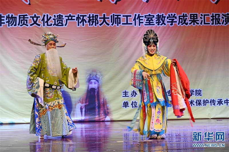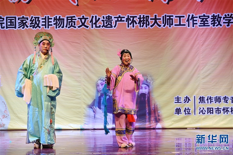 6月8日,焦作师范高等专科学校学生活动中心礼堂,怀梆艺术国家级非遗代表性传承人赵玉清(右)、省级非遗代表传承人孙国成在演出传统怀梆折子戏《老少换》。