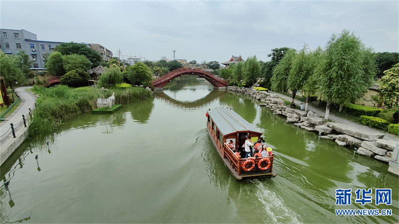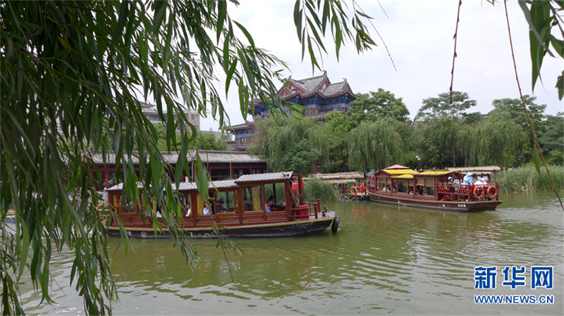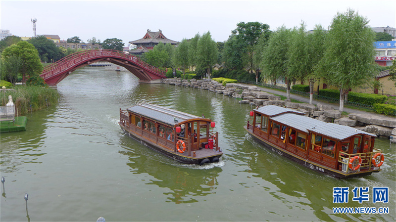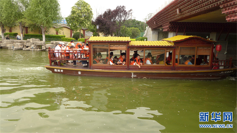 6月11日,河南省开封市大宋御河,人们乘坐“水上巴士”进行游览观光。