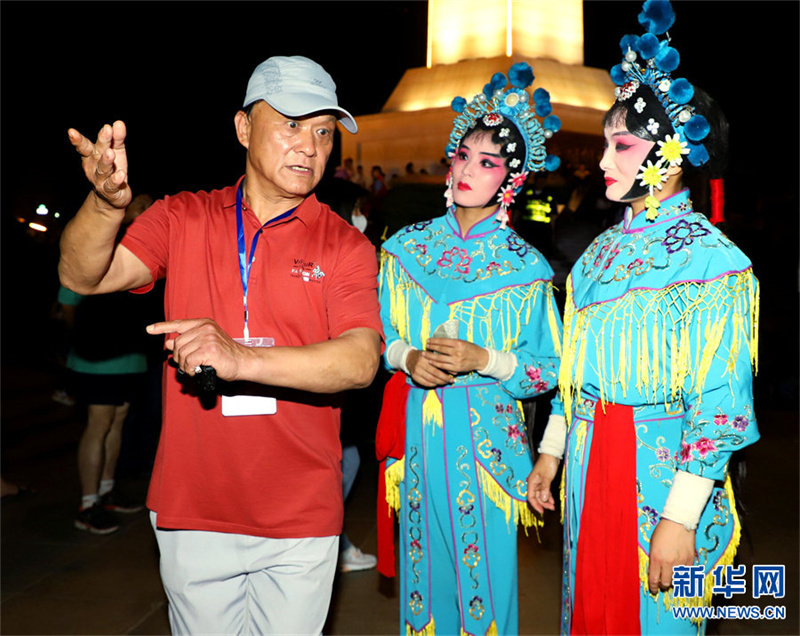 6月12日晚,河南省南阳市解放广场,南阳市内乡宛梆剧团的导演在后台给演员做艺术指导。