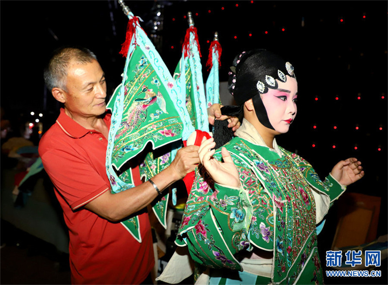 6月12日晚,河南省南阳市解放广场,南阳市内乡宛梆剧团的工作人员在后台帮助演员穿“大靠”。