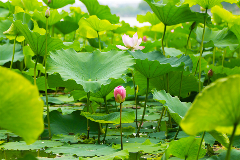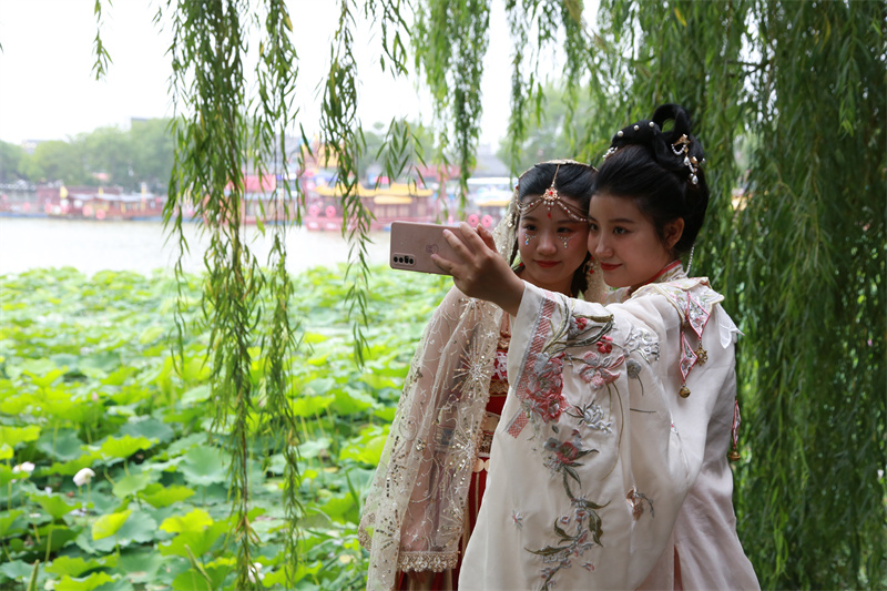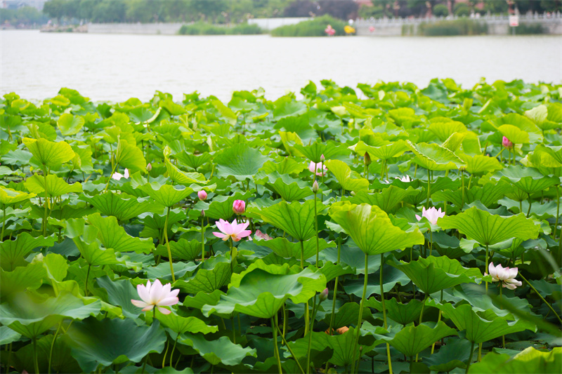 在开封一景区,荷花盛开,荷香随风四溢,吸引游客打卡拍照。