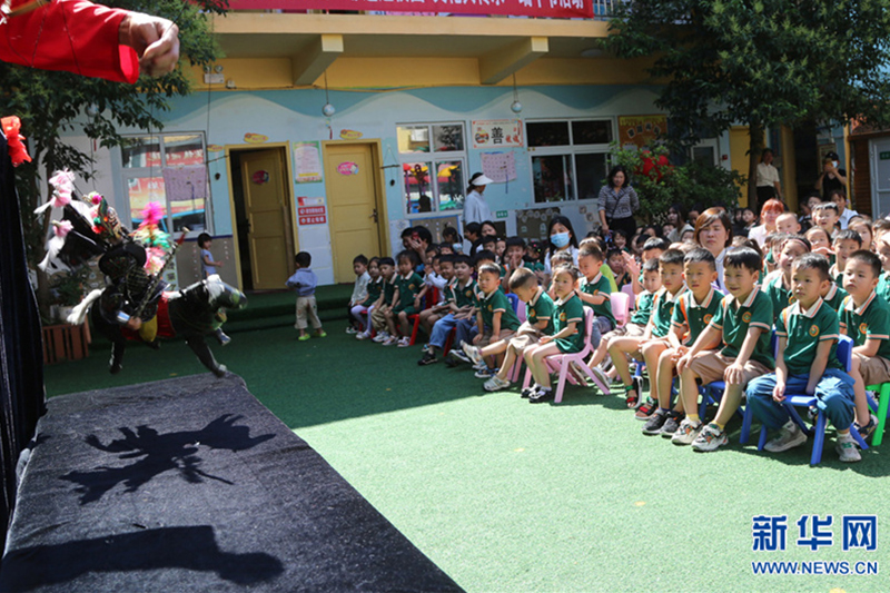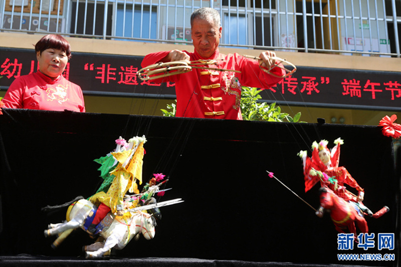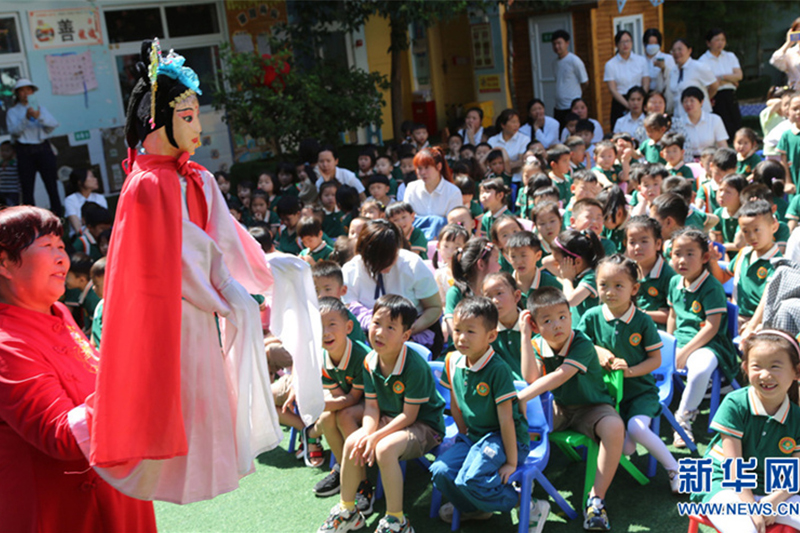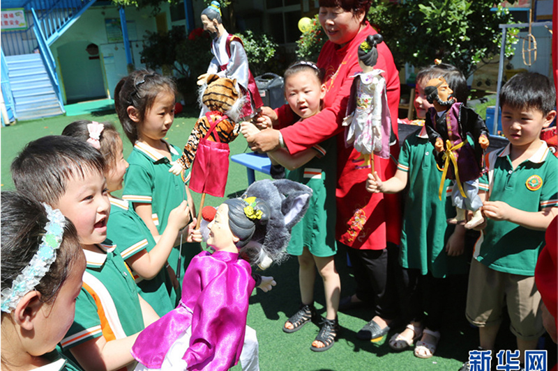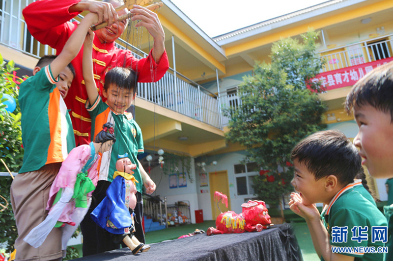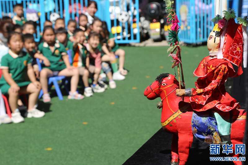 6月19日,河南省宝丰县育才幼儿园,小朋友在体验非遗项目。6月19日,河南省宝丰县育才幼儿园开展“演木偶 传非遗”主题活动,让小朋友零距离体验非遗的独特魅力。新华网发(王双正 摄)