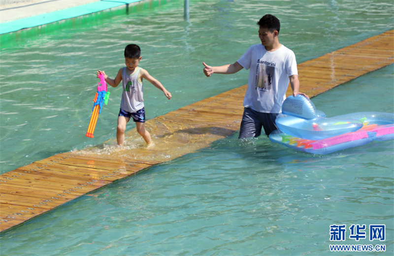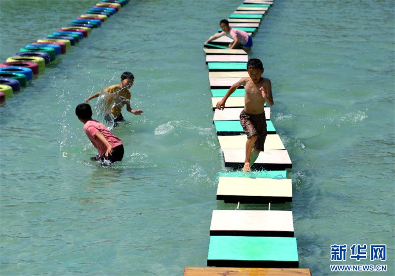 6月23日,河南省南阳市卧龙区蒲山镇蓝达农庄,游客在水上乐园游玩。(高嵩 摄)