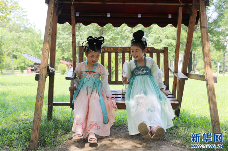 6月22日,河南省焦作市温县陈家沟,两名身着汉服的小朋友在玩耍嬉戏。(徐宏星 摄)