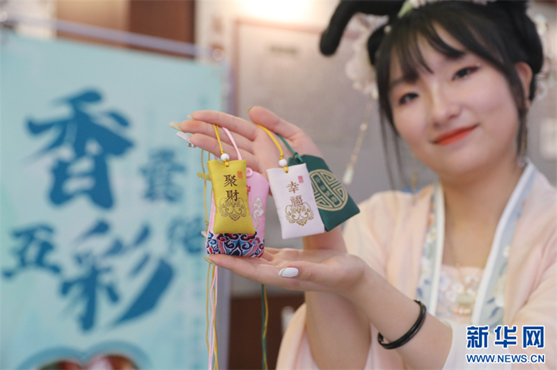 6月22日,河南省焦作市温县陈家沟,汉服爱好者展示自己制作的中草药香囊。(徐宏星 摄)