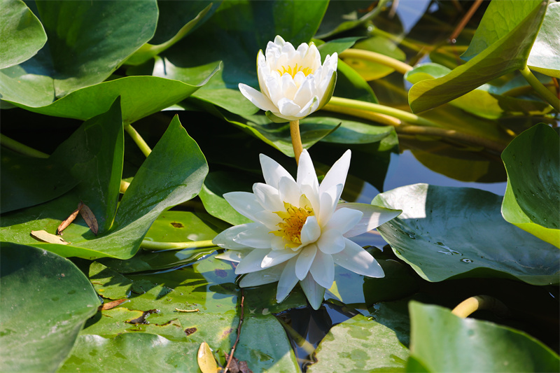 6月26日,开封涧水河成片睡莲竞相绽放,洁白花朵点缀在河面上,一派生机盎然的夏日景象。开封+记者 石斐 摄