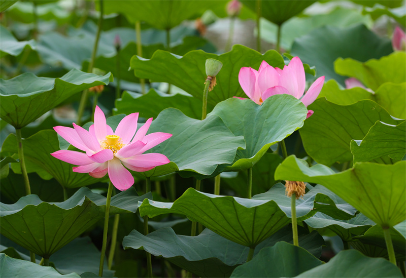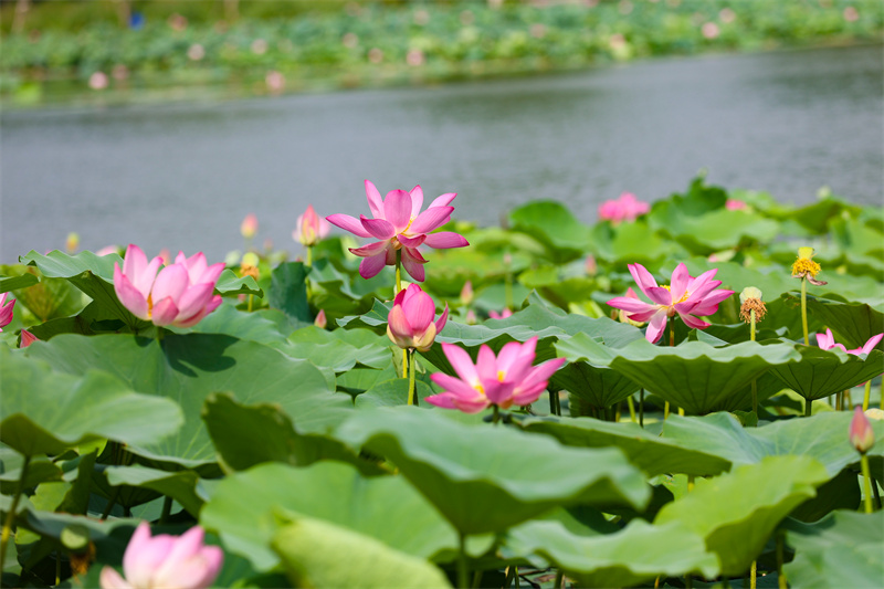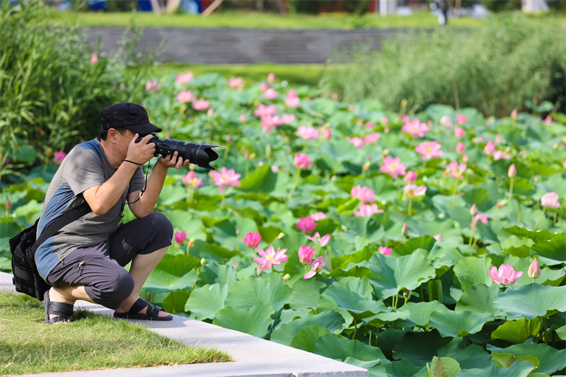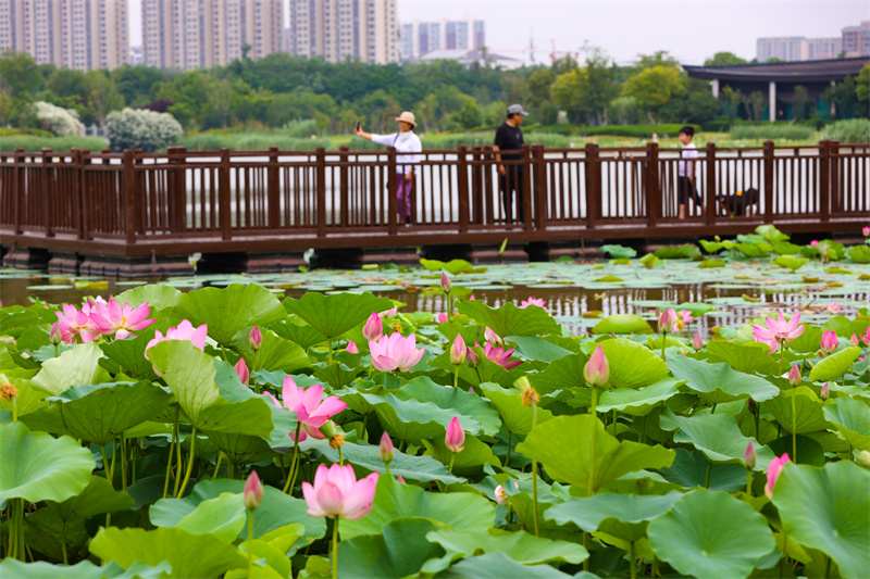 夏日里,开封西北湖湿地公园的荷花盛开,吸引市民驻足欣赏。开封+记者 石斐 摄