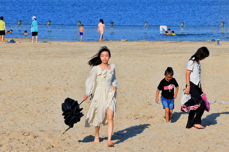 7月4日,开封市天气晴朗,在蓝天白云的映衬下,黑岗口调蓄水库景色优美,吸引众多市民前来游玩。开封+记者 李浩 摄