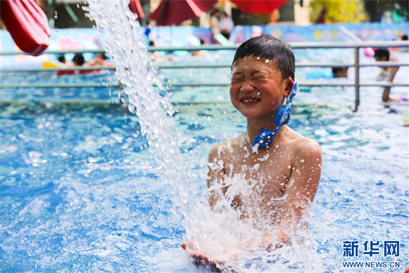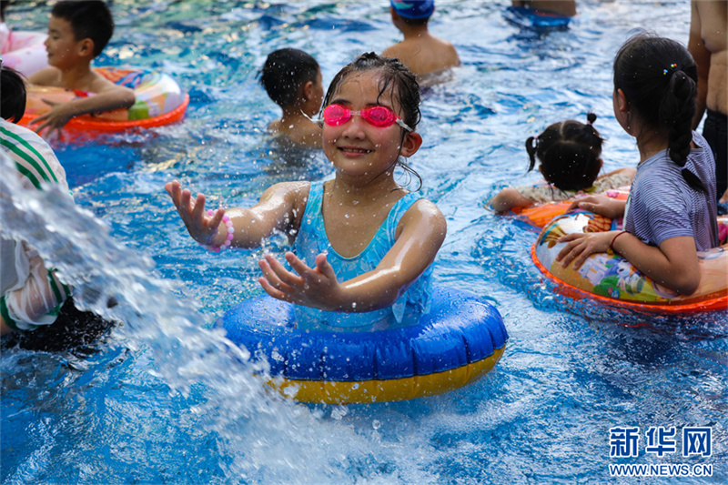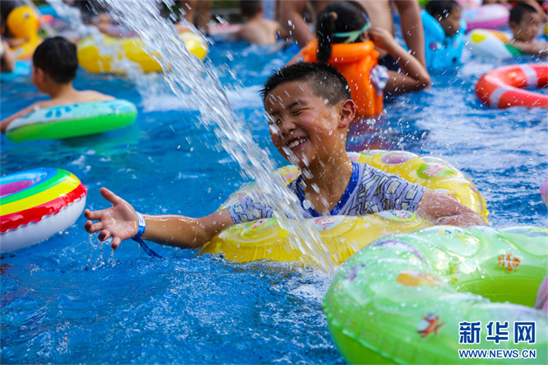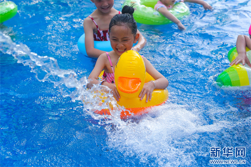 7月10日,河南省信阳市光山县,小朋友在游泳馆玩耍。近日,高温天气持续,不少家长选择带领孩子到游泳馆等地游玩,乐享夏日清凉。新华网发(谢万柏 摄)