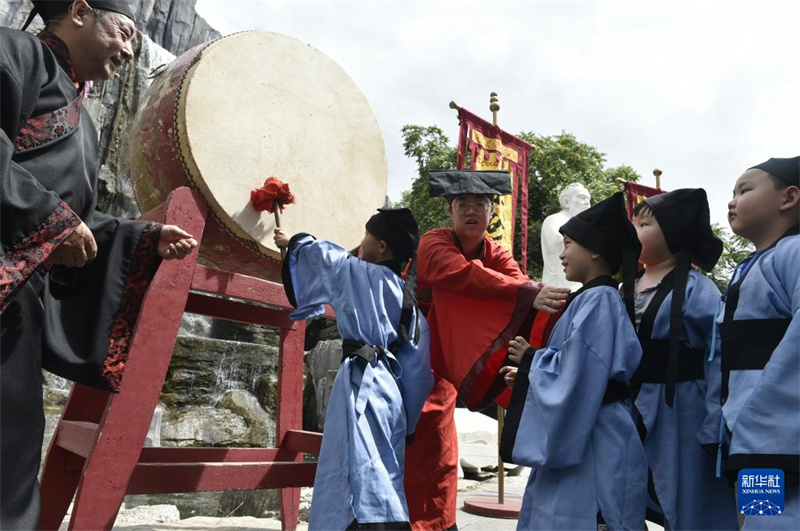 7月14日,在开封市中国翰园碑林景区,参加研学活动的小朋友参与“击鼓明志”仪式。进入暑期,许多家长和学生来到河南开封,参加丰富多彩的暑期研学活动。依托丰富的历史文化和旅游景区、文博场馆等资源,河南开封从研学基地基础设施、研学课程开发和研学指导老师队伍建设等方面着手,提升文旅资源的教育功能,高标准打造研学旅行基地。新华社记者 鲁鹏 摄