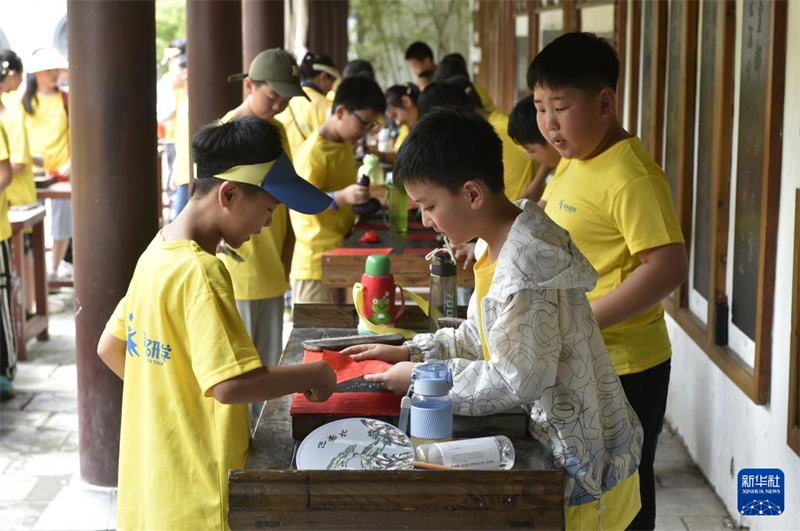 7月14日,在开封市中国翰园碑林景区,参加研学活动的学生体验拓片制作技艺。进入暑期,许多家长和学生来到河南开封,参加丰富多彩的暑期研学活动。依托丰富的历史文化和旅游景区、文博场馆等资源,河南开封从研学基地基础设施、研学课程开发和研学指导老师队伍建设等方面着手,提升文旅资源的教育功能,高标准打造研学旅行基地。新华社记者 鲁鹏 摄