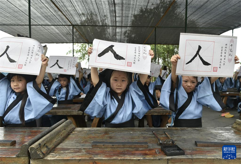 7月14日,在开封市中国翰园碑林景区,参加研学活动的小朋友展示自己书写的“人”字。进入暑期,许多家长和学生来到河南开封,参加丰富多彩的暑期研学活动。依托丰富的历史文化和旅游景区、文博场馆等资源,河南开封从研学基地基础设施、研学课程开发和研学指导老师队伍建设等方面着手,提升文旅资源的教育功能,高标准打造研学旅行基地。新华社记者 鲁鹏 摄