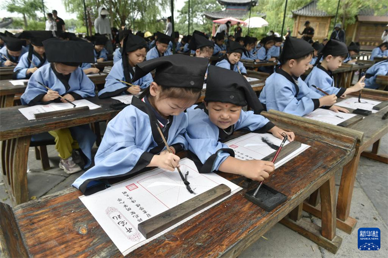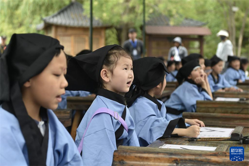 7月14日,在开封市中国翰园碑林景区,参加研学活动的小朋友参加“开笔礼”活动。进入暑期,许多家长和学生来到河南开封,参加丰富多彩的暑期研学活动。依托丰富的历史文化和旅游景区、文博场馆等资源,河南开封从研学基地基础设施、研学课程开发和研学指导老师队伍建设等方面着手,提升文旅资源的教育功能,高标准打造研学旅行基地。新华社记者 鲁鹏 摄