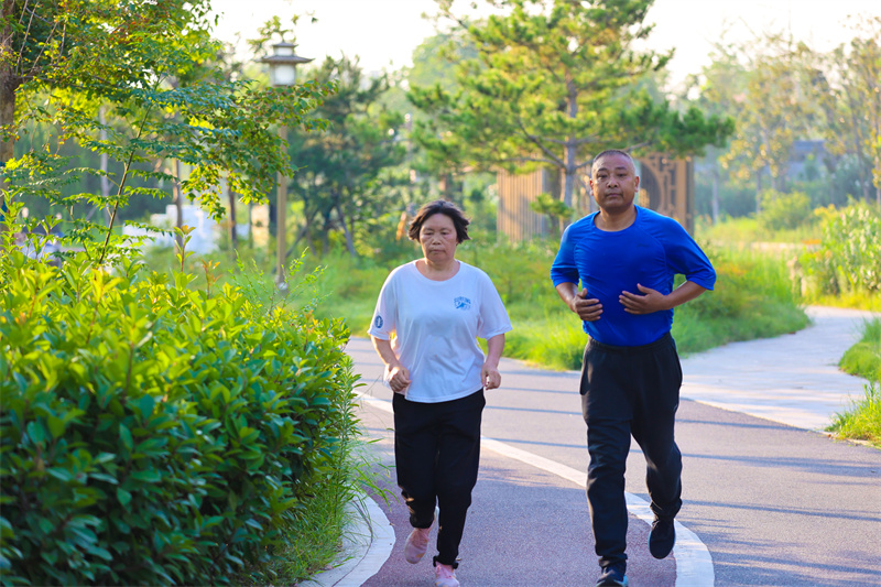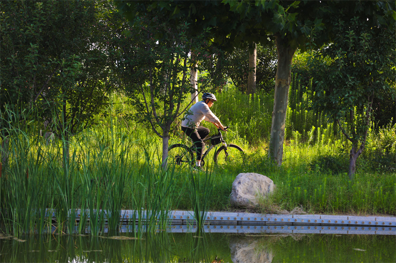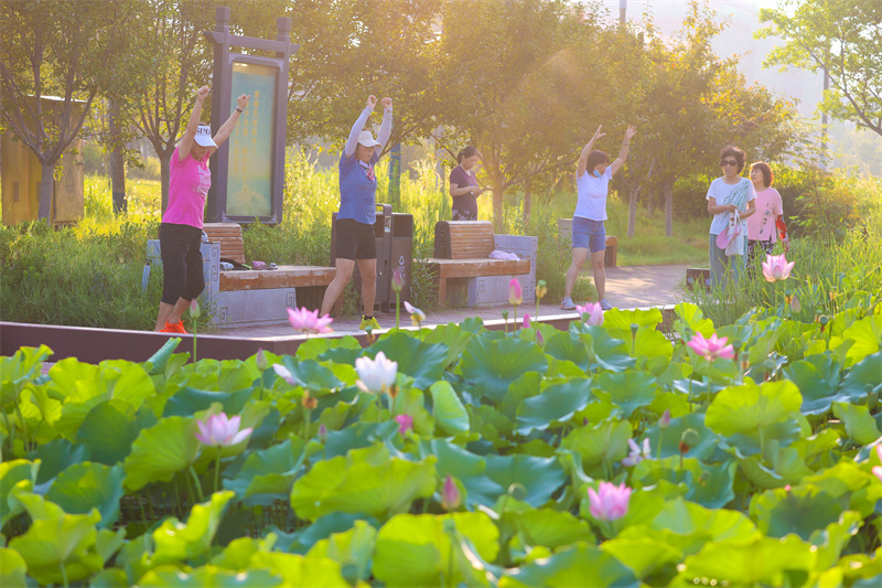 7月17日清晨,朝阳中,开封涧水河岸边花草繁盛、环境迷人,吸引不少市民前来健身休闲。开封 记者 石斐 摄