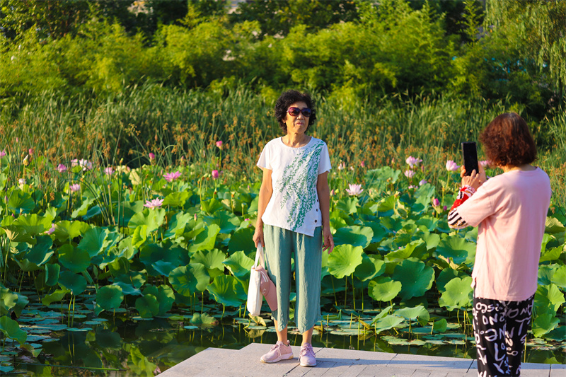 7月18日,涧水河里的朵朵荷花把河面点缀得粉嫩清新,层层叠叠,呈现出“接天莲叶无穷碧,映日红花别样红”的景色,微风吹起,荷香四溢,清凉感随之而来。开封+记者 石斐 摄