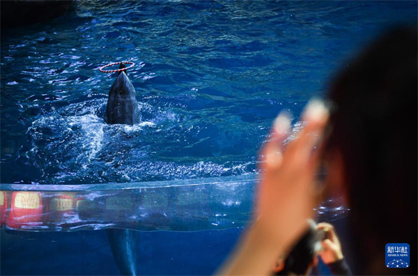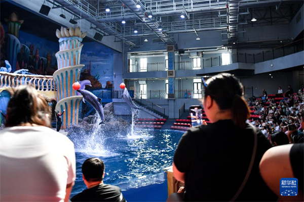 7月18日,游客在郑州海洋馆内观看海豚表演。暑期,众多游客带着孩子走进郑州海洋馆,观看动物表演,了解海洋知识。新华社记者 吴刚 摄