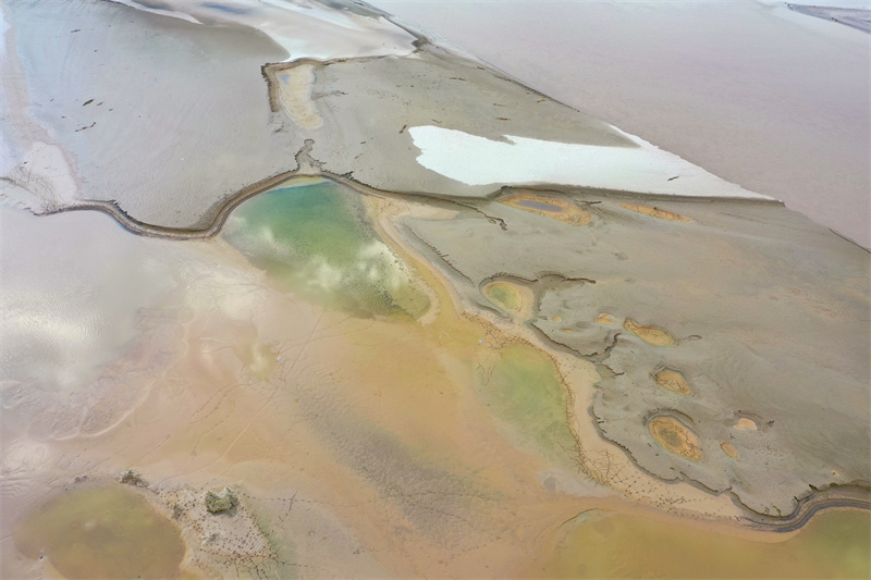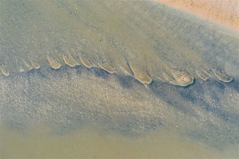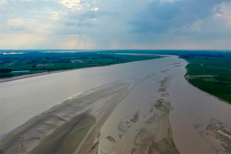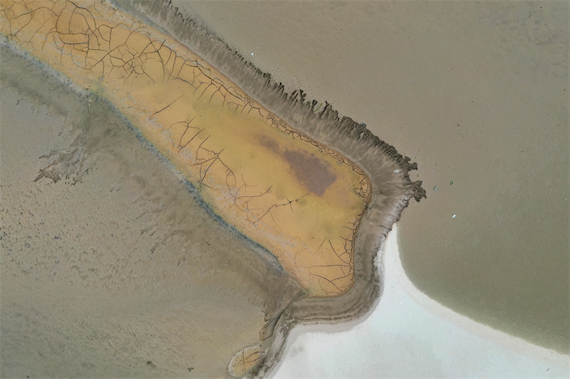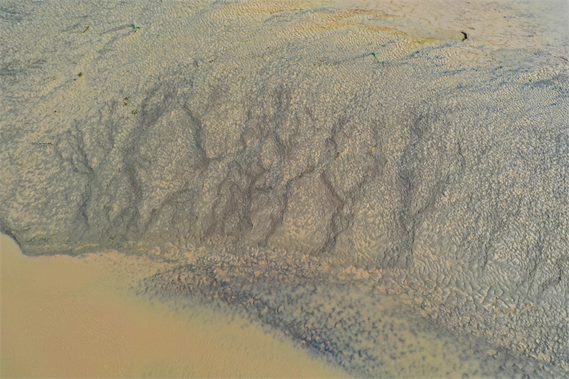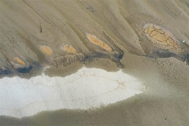 随着黄河水位下降,大面积河床裸露出水面,河水在河床上冲刷留下的痕迹形成黄河“沙画”,从空中俯瞰,蔚为壮观。开封+记者石斐7月20日摄