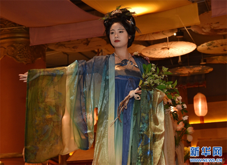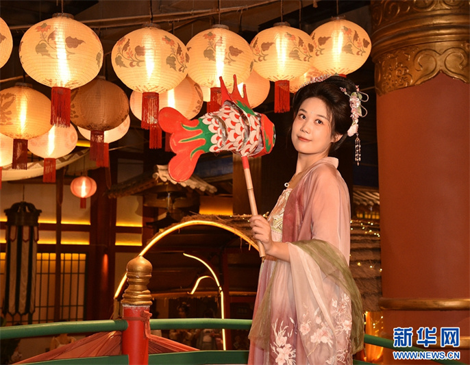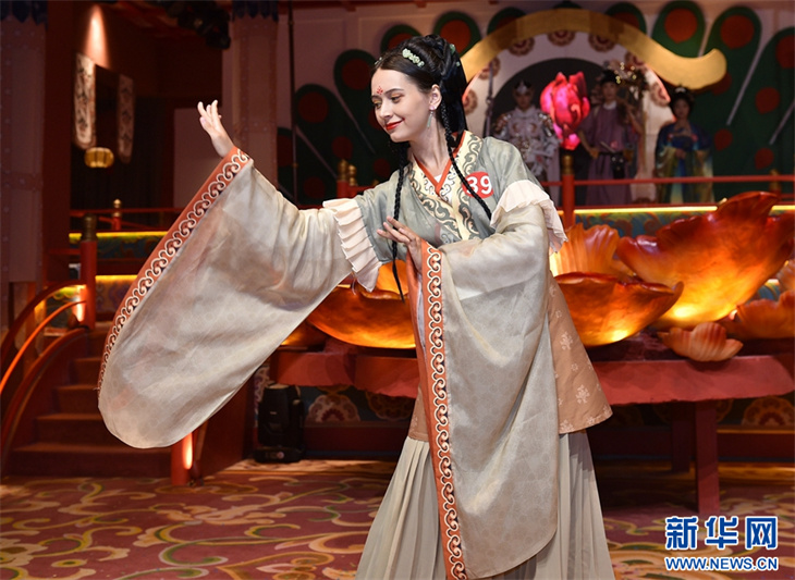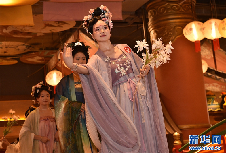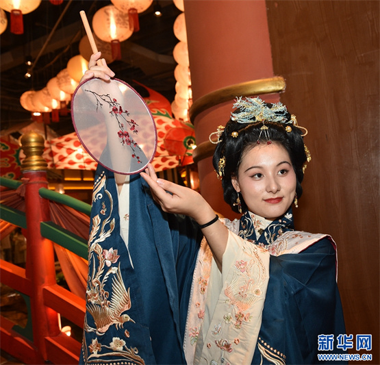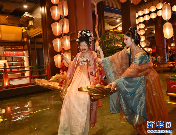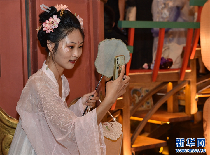 7月22日,郑州市星河里·唐宫夜宴实景文化主题街区,汉服爱好者在表演。炎炎夏日,郑州市星河里·唐宫夜宴实景文化主题街区举办“华裳汉典”汉服礼仪文化展示活动,吸引了众多游客的目光,不少人穿着汉服,感受着中华传统服饰文化的魅力。新华网发(丁友明 摄)