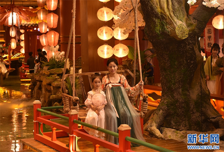 7月22日,郑州市星河里·唐宫夜宴实景文化主题街区,汉服爱好者在游玩。