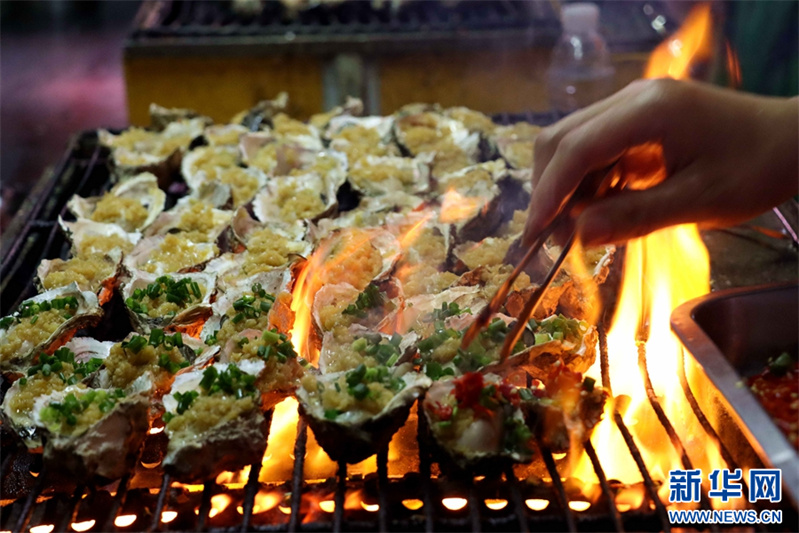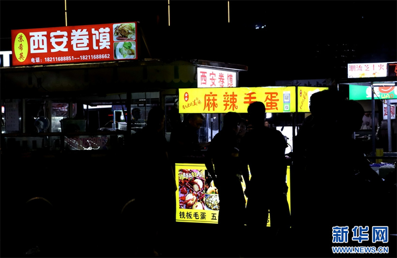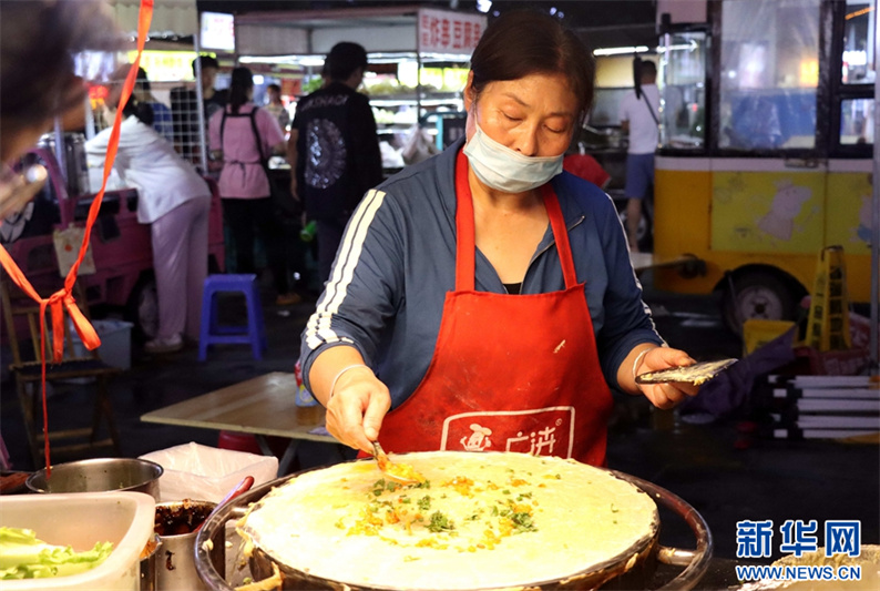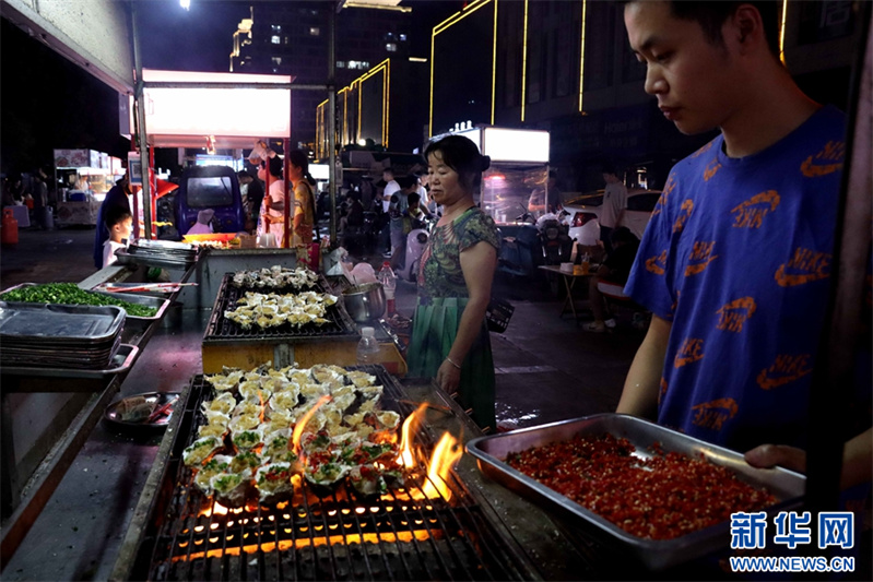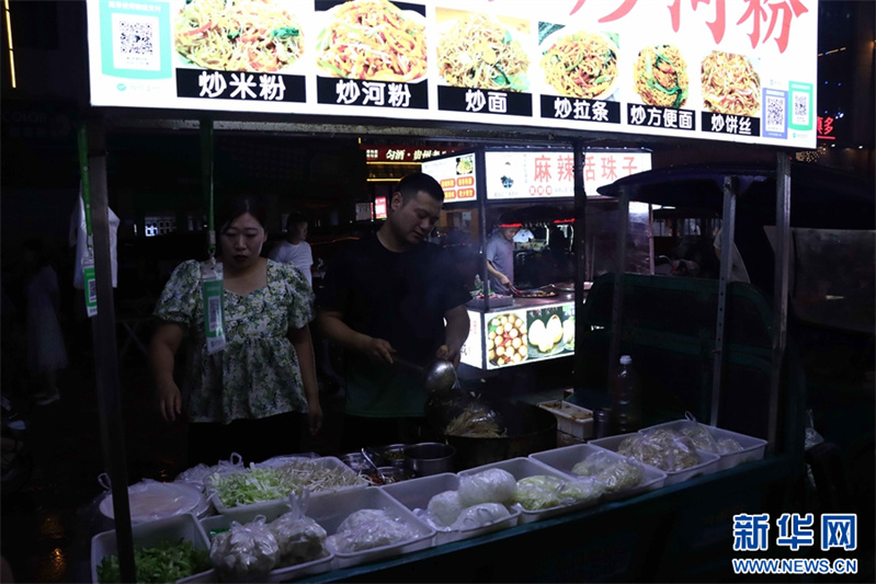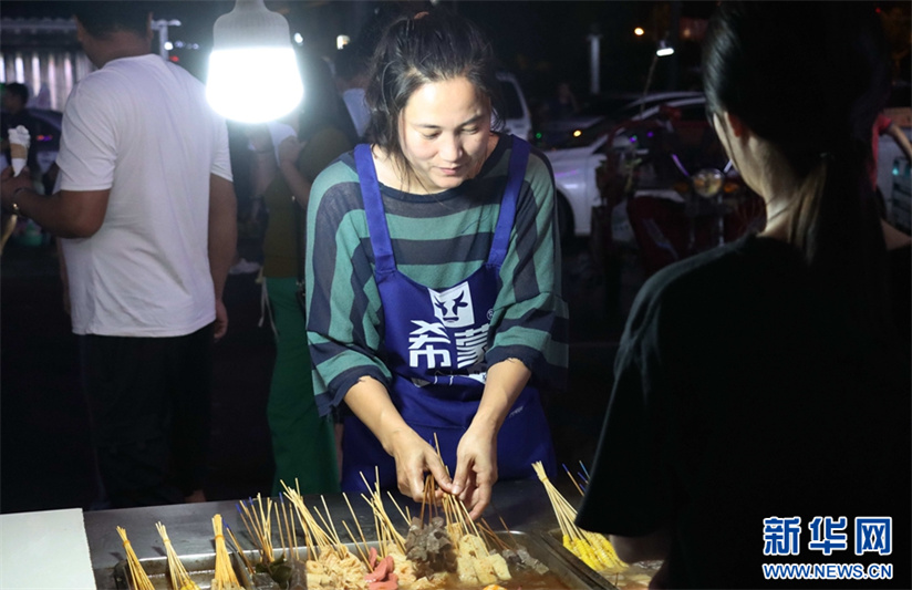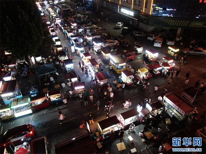 7月25日,在河南省安阳市内黄县万洋广场拍摄的夜市摊位。盛夏时节,河南省安阳市内黄县的夜经济持续火热,琳琅满目的地方特色小吃和文化商品,吸引了众多市民、游客前来消费纳凉,给夜幕下的内黄添上了几许“烟火气”。新华网发(刘肖坤 摄)