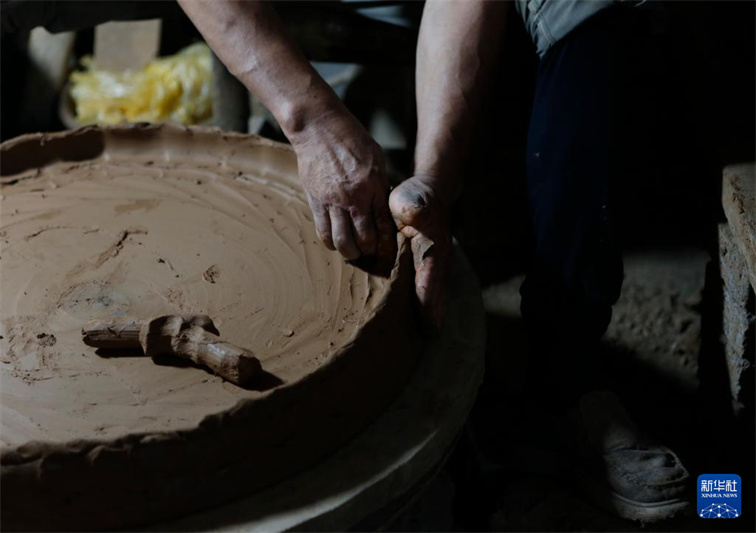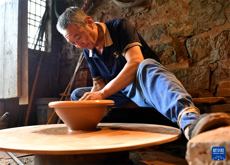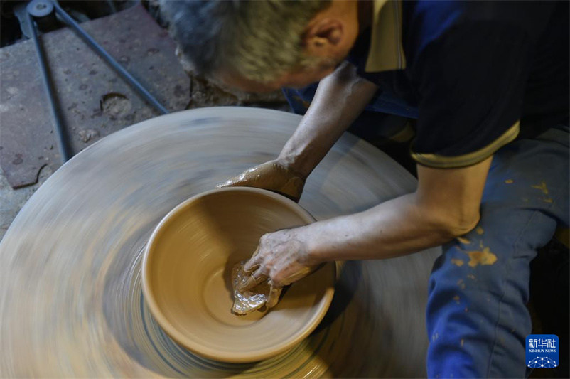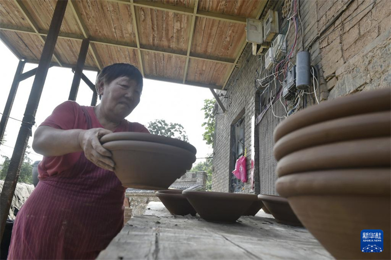 7月27日,制陶艺人在盆窑村的家庭作坊里制作黑陶产品。河南省沁阳市山王庄镇盆窑村烧制黑陶历史悠久,2009年盆窑黑陶制作技艺被列入河南省非物质文化遗产名录,2021年该村被公布为河南省第六批传统村落。近年来,当地以打造“盆窑黑陶小镇”项目为引领,通过“公司+家庭作坊+农户”的经营模式,带动全村450多户从事黑陶制造加工,黑陶产业年产值达5000余万元,“陶乡窑火”成为助力村民增收致富的乡村新风景。新华社记者 鲁鹏 摄