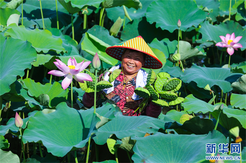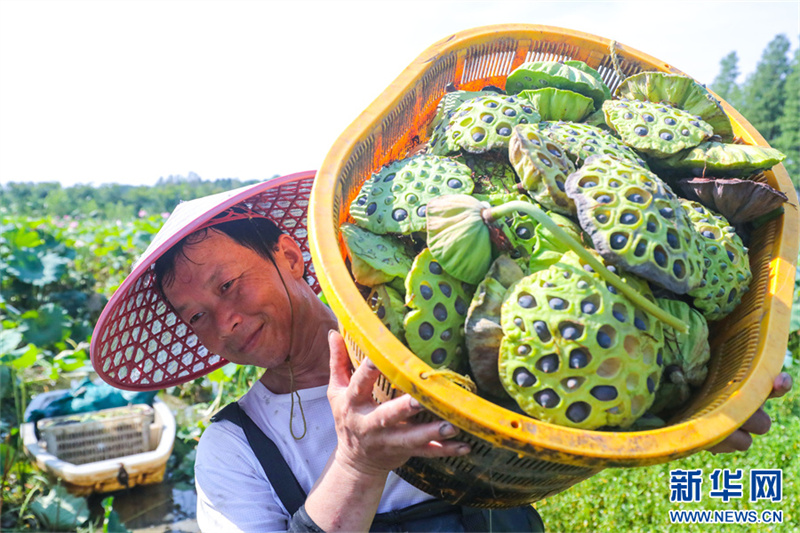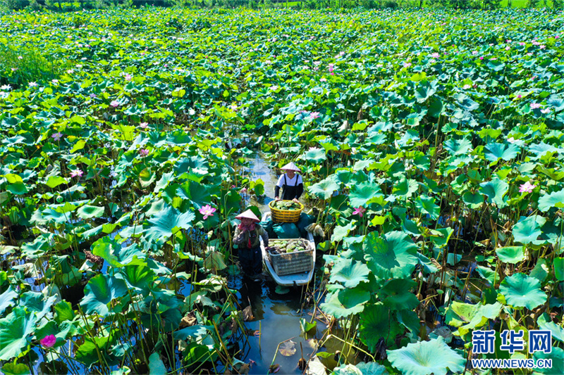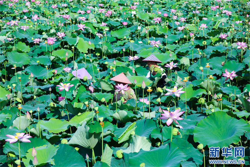 7月31日,河南省信阳市光山县砖桥镇李岗村,农民在采摘莲子。时下,光山县今年引进种植的4万多亩太空莲进入收获季,村民们正忙着采莲蓬、剥莲子,处处呈现出一派喜人的丰收景象。新华网发(谢万柏 摄)