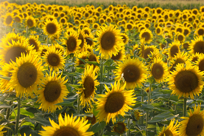 8月7日,城乡一体化示范区水稻乡双河铺村的油葵竞相开放,盛开的油葵花宛如金色的海洋,美不胜收,形成了一幅幅独特的乡村风景画。开封+记者 石斐 摄