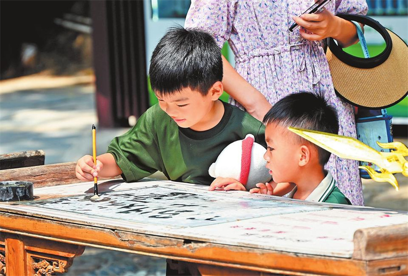 8月9日,孩子们在开封市翰园碑林内体验青砖练字的乐趣。暑假里,开封市多个公园景点成为中小学生旅游研学的好去处,孩子们在休闲放松的同时,又亲身感受中国传统文化。李俊生 摄