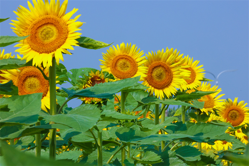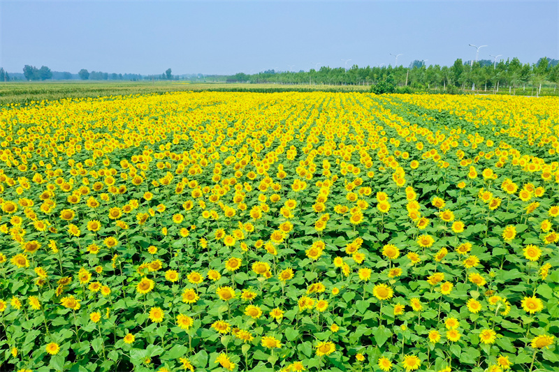 8月11日,在城乡一体化示范水稻乡双河铺村,一株株金黄色的油葵花在阳光照射下,正竞相绽放,绿油油的硕大油葵叶与金灿灿的油葵花朵相映成趣、美不胜收,形成了一幅美丽的乡村风景画,给乡村增添了无限趣味。