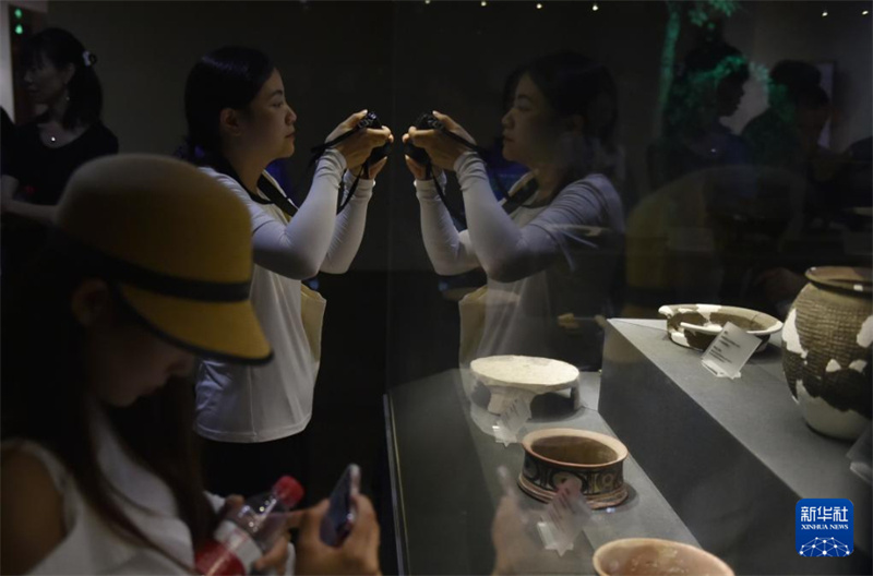 8月8日,参加集中采访的媒体记者在位于河南省郑州市的大河村遗址博物馆参观拍照。近年来,河南持续做好考古发掘和研究阐释,深入挖掘历史文化蕴含的时代价值,让中华优秀传统文化焕发新活力、展现新魅力。记者近日参加“行走河南·读懂中国”考古发现集中采访活动,先后探访众多考古遗址和博物馆,实地感受中华文明发展的重要节点。新华社记者 鲁鹏 摄