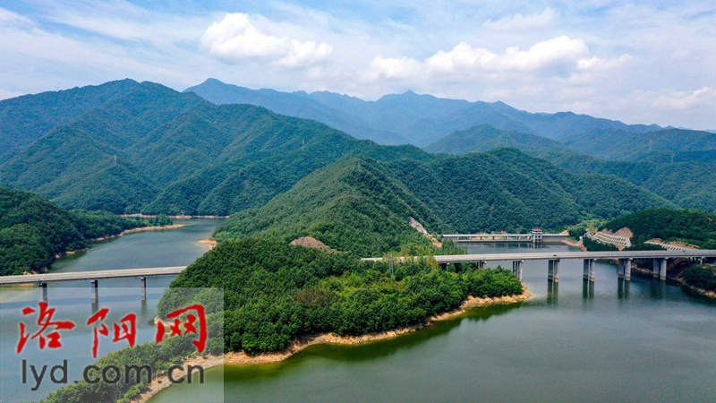 栾川县庙子镇盘龙湖湖水清莹,周边山峦叠翠。