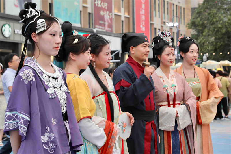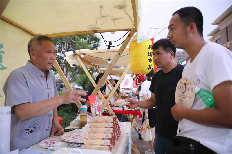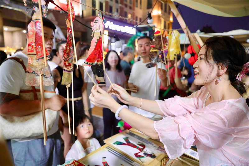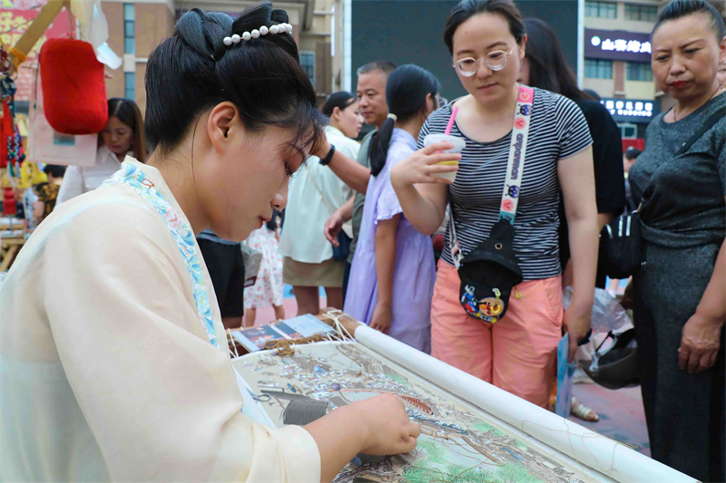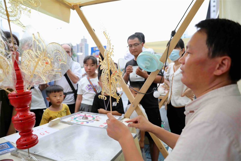 8月18日晚,非遗市集现场热闹非凡,吸引众多市民游客前来逛集市赏非遗,多姿多彩、绘声绘色的非遗文化让大家流连忘返。开封+记者 姜菡 摄