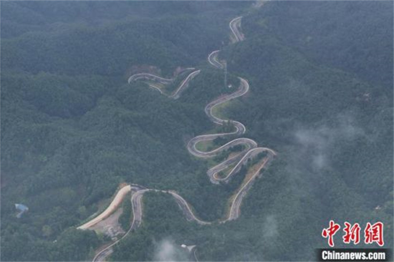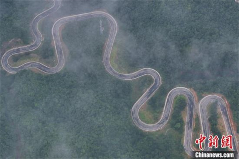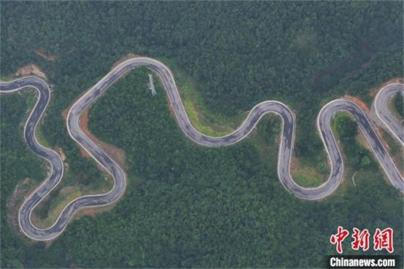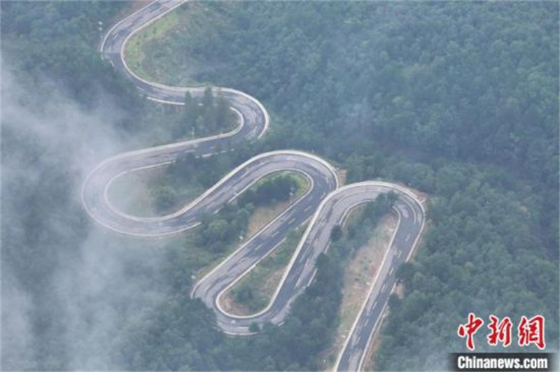 近日,河南南阳西峡县老界岭景区漫山油绿。从高空俯瞰,盘山公路顺着山势蜿蜒游弋,宛若银蛇,呈现出一幅美丽的生态画卷。据了解,这条盘山公路全长5公里,绵延在海拔800米至1100米的森林中,共48道弯。老界岭崎岖山路似“银蛇”。 余泽厚 摄